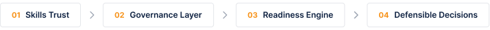 Convert governed standards into deployable workforce decisions. Produces explainable readiness logic — not dashboards — answering: Who is ready, for what, and why?